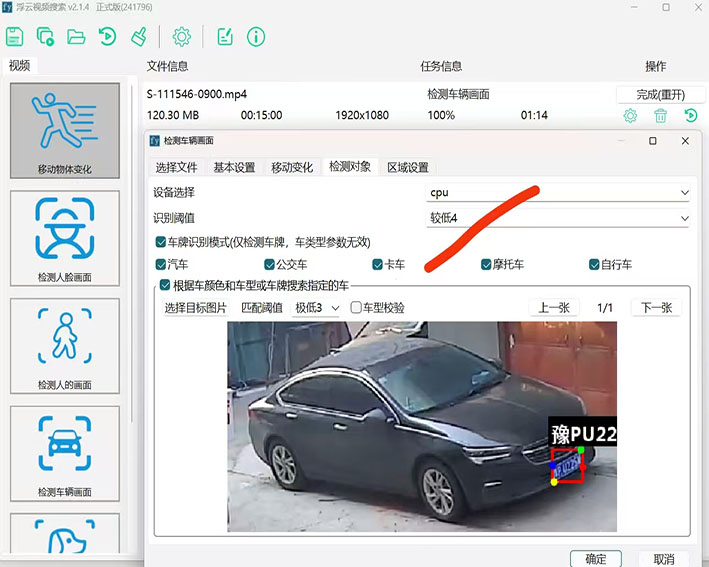 比如今天我在进行指定车牌搜索时,明明视频中有该车辆,目标图片也很清楚。就是搜不出结果。见下图,通过把识别阀值降低就能找到结果了。