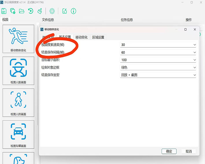 此外,在使用移动物体变化、检测人脸画面和检测人的画面等功能时,还要注意搜索倍速和结果保存间隔这两个参数,可以先使用默认值,看结果的情况,再进行参数调节。如果结果过多,且重复,可以调大两个参数;如果结果过少,怕漏掉一些画面,那就调小参数。